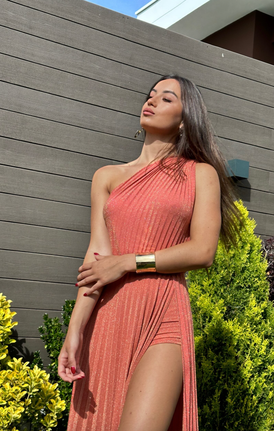 In stile dea, questo abito elegante e sensuale è perfetto per le cerimonie. Con la sua monospalla e lo spacco, dona una silhouette slanciata ed è impreziosito da un leggero plissé. Garantisce una presenza incantevole e un look unico.