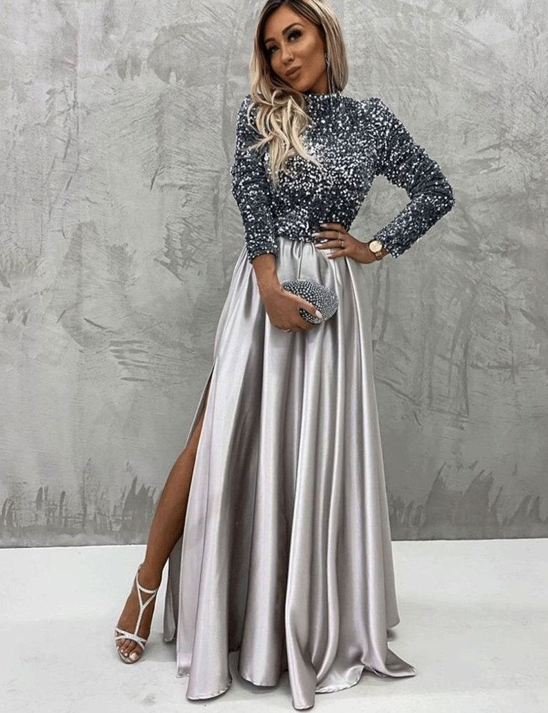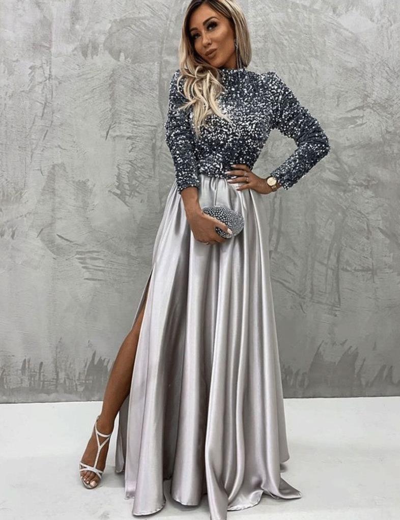 L'abito Sara è un elegante abito con maniche lunghe e paillettes che si adatta perfettamente alle curve del corpo, aggiungendo un tocco di eleganza. Lo spacco laterale rende l'abito unico e perfetto per ogni occasione.
