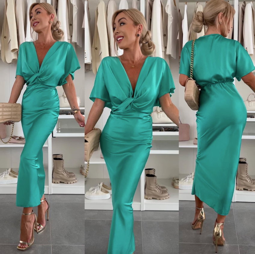 Il vestito nero in raso Whitney è un elegante abito lungo che unisce sensualità ed eleganza, perfetto per le serate fuori e le occasioni speciali. La profonda scollatura a busta enfatizza le forme femminili, mentre la torsione in vita aggiunge carattere. Tagliato in vita per una migliore vestibilità, le maniche corte e larghe assicurano comfort. Crea uno stile unico con questo abito che attirerà gli sguardi.